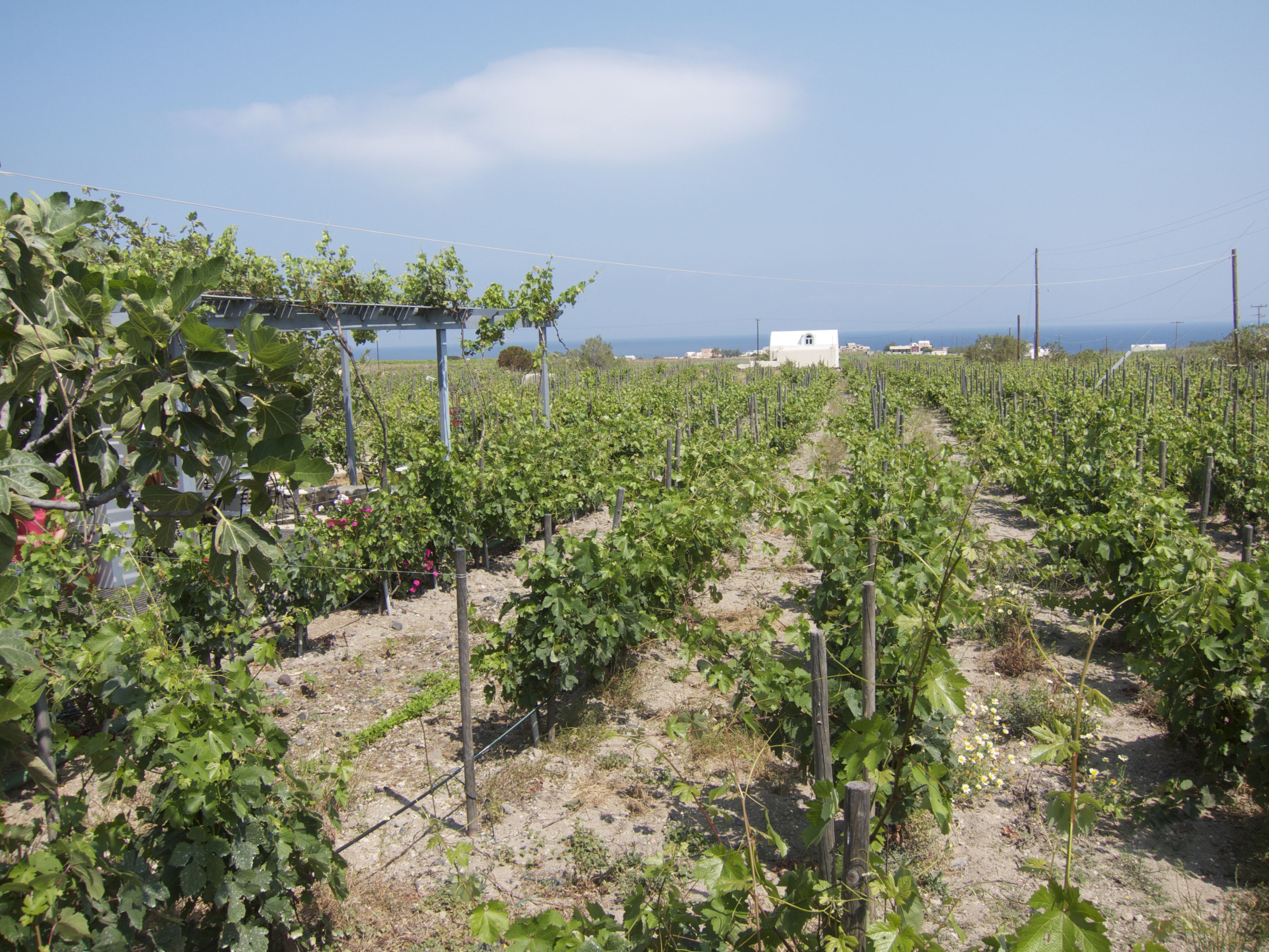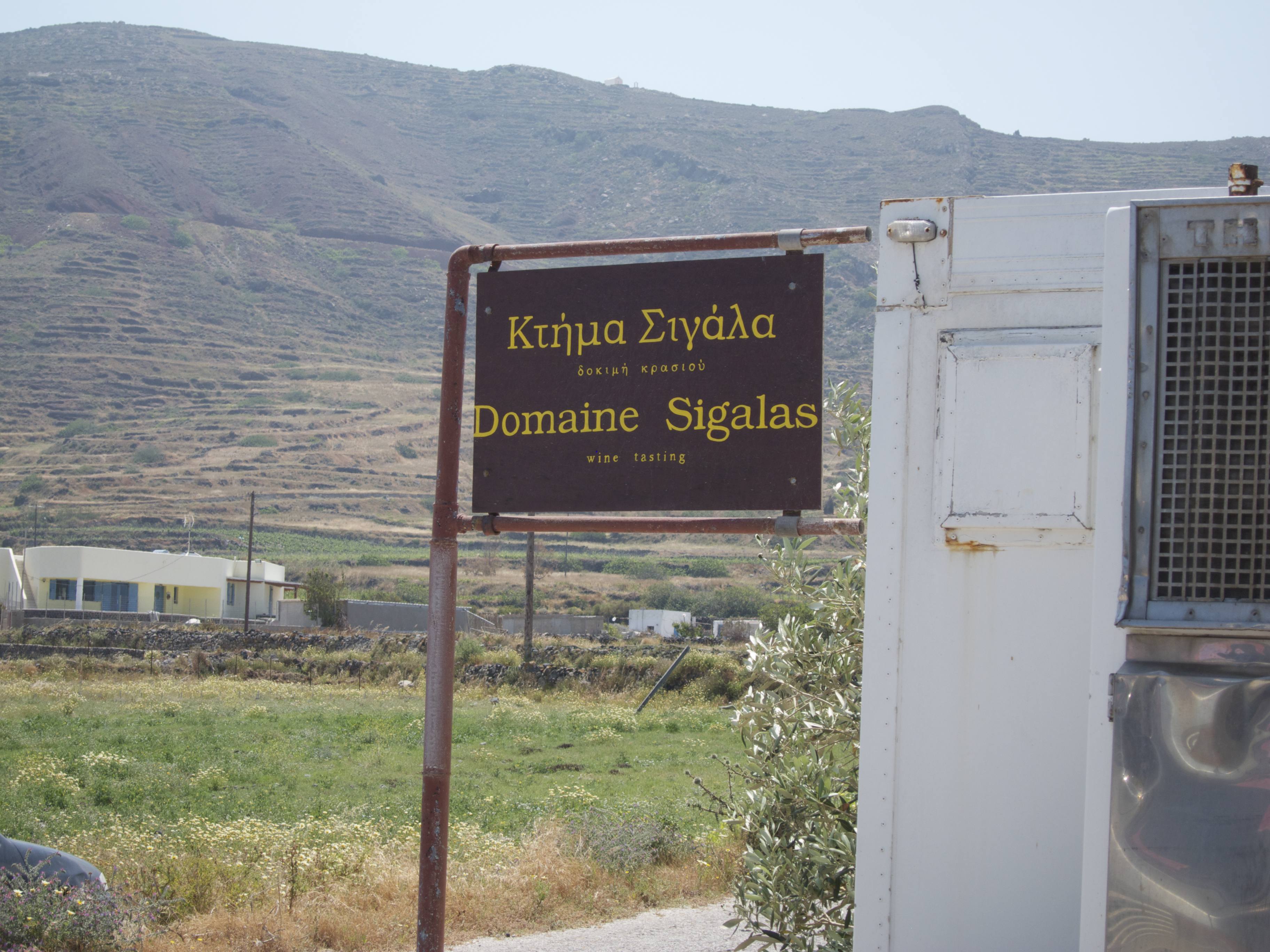 The second winery was Sigalas, a more established and albeit more elegantly presented winery. It was set up for the tourists and catered to the bus-style crowd. That said, we arrived when there were no other tasters around (yes, it was first thing in the morning – just before noon – and yes, we are ‘early risers’ when it comes to wine) and got a prime seat outside in the Santorini sun overlooking the vines and the sea view. The vineyard was just outside of IA, the main tourist area, on a gently sloping field benefiting from the sea air and much gentler winds than the vineyards in Pyrgos. The wines here were charged by the taste but we came on the lucky Sunday (yes, Sunday) where the tastes were free and all bottles 20% off. While I enjoyed the wines, it was a different experience and I ended up only taking home a bottle of the Vin Santo – a wine famous and exclusive to Santorini made of sun-dried white grapes. Overall another fun experience.