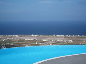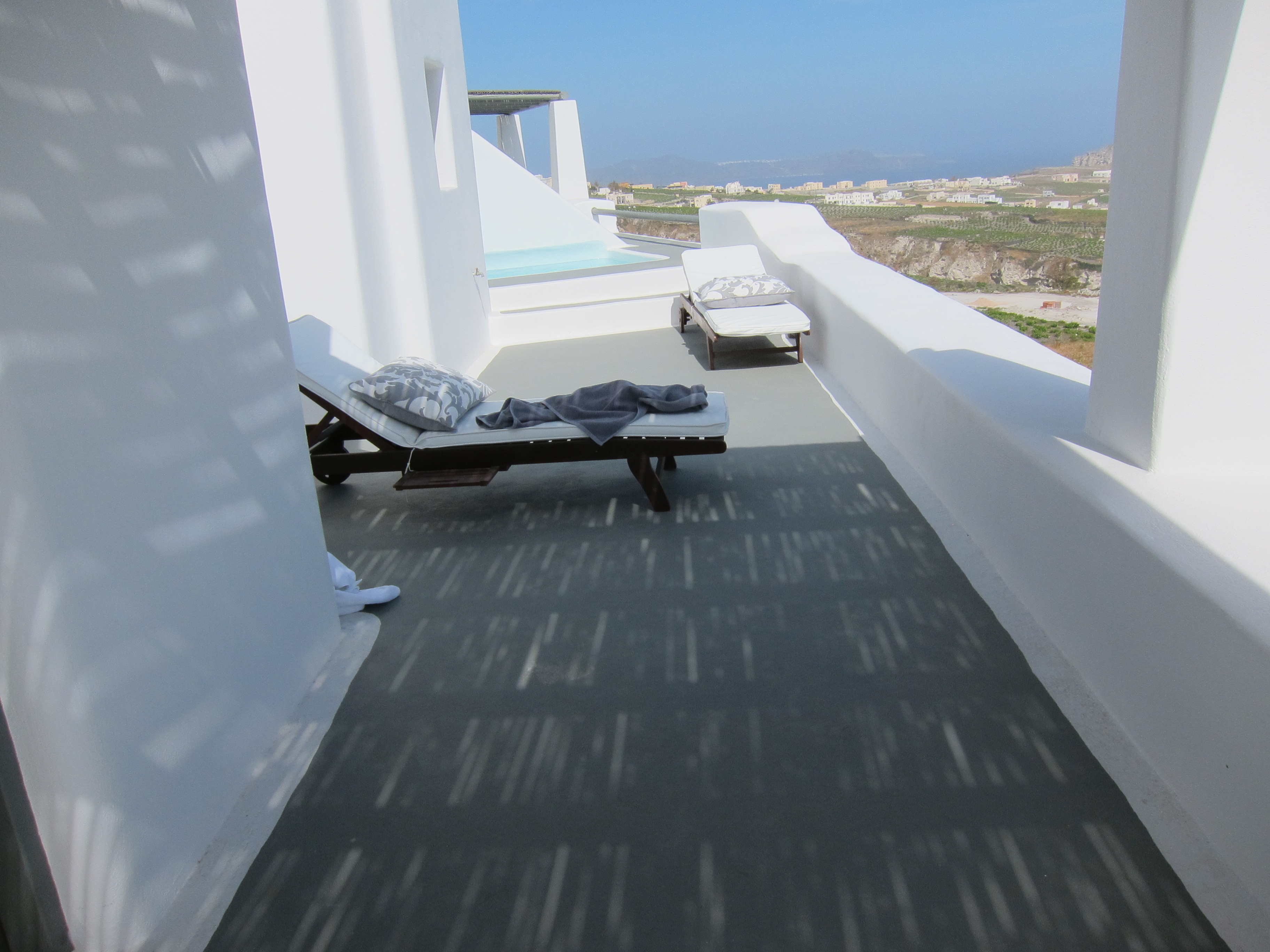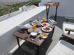 We stayed at a gorgeous place with only 10 or so rooms (more like villas really) called Carpe Diem. We had our own private terrace overlooking the island and the vineyards. I had found it through the travel site VoyagePrive.com which offers discounts at luxury travel sites (likeliving social for travel) and thus got a few things thrown in for free like a bottle of wine in our room. Every morning we had a ridiculously amazing breakfast brought to our room. Seriously – it was hard to beat. Greek yogurt & honey, Greek pie (my favorite new dish – feta cheese, egg & milk baked in a filo dough bottom crust. Yes, we did ask for the recipe…and yes I am turning into my mother), fresh Greek cheeses, fresh fruit, croissants & fresh bread, eggs, bacon, etc. Just thinking about it is making me gain more weight…