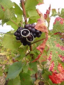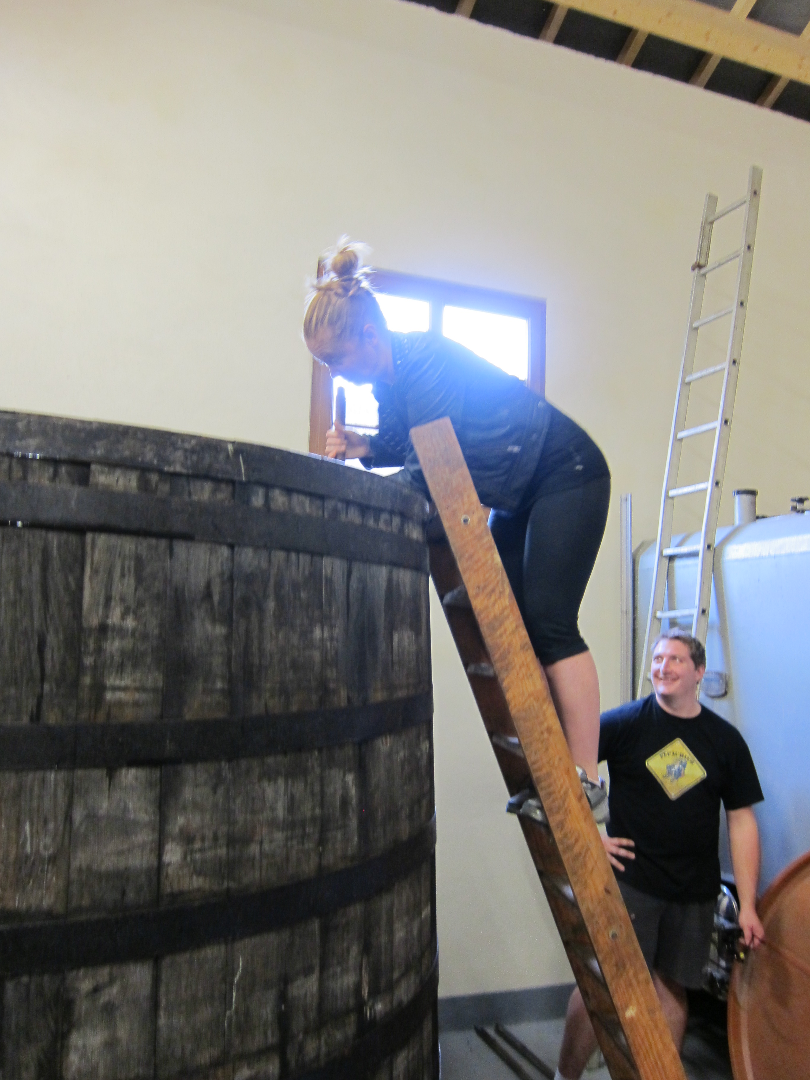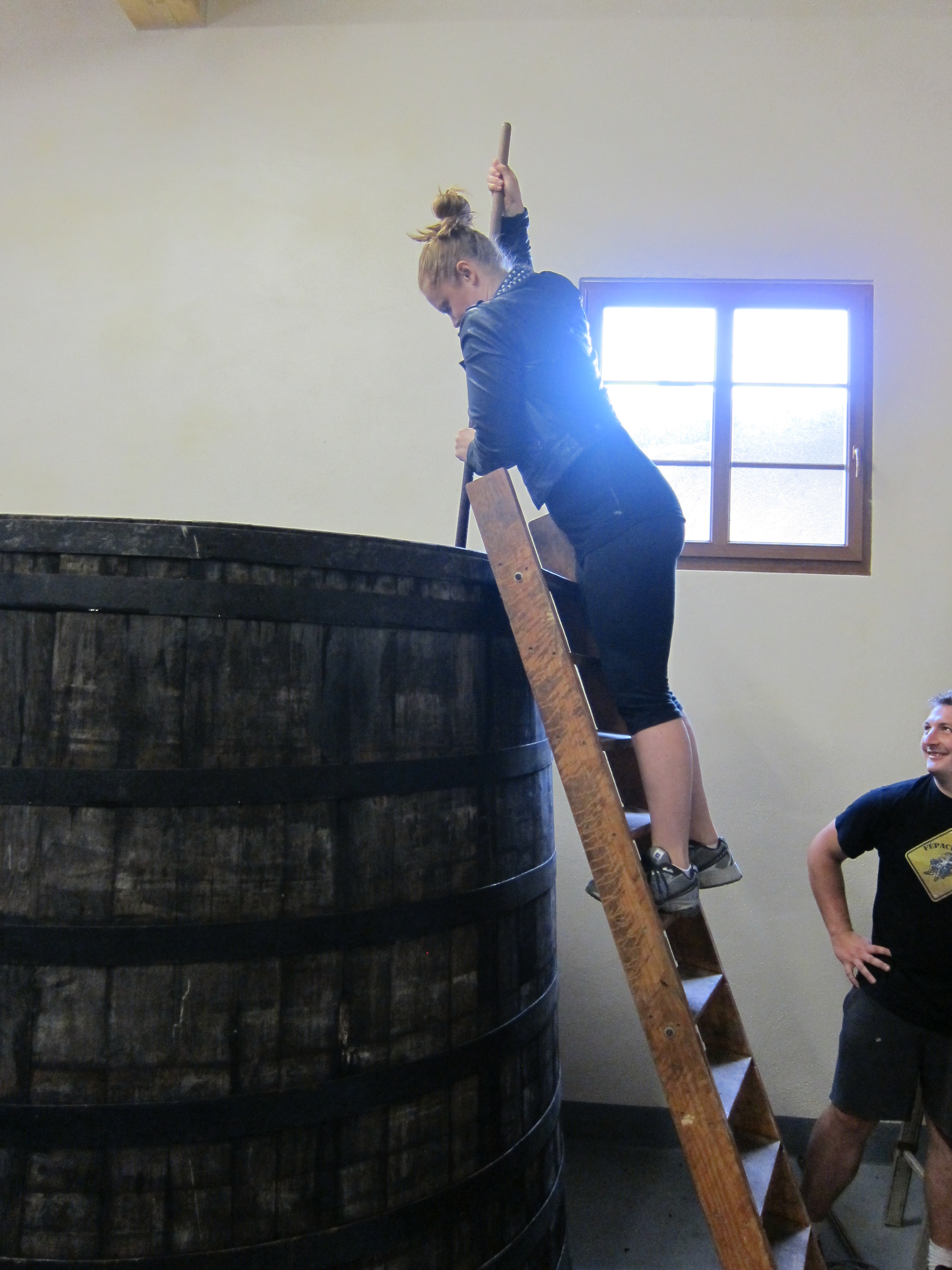 The winemaker at Chateau Lahaye allowing me to ‘break through the must’ on their newest harvest.